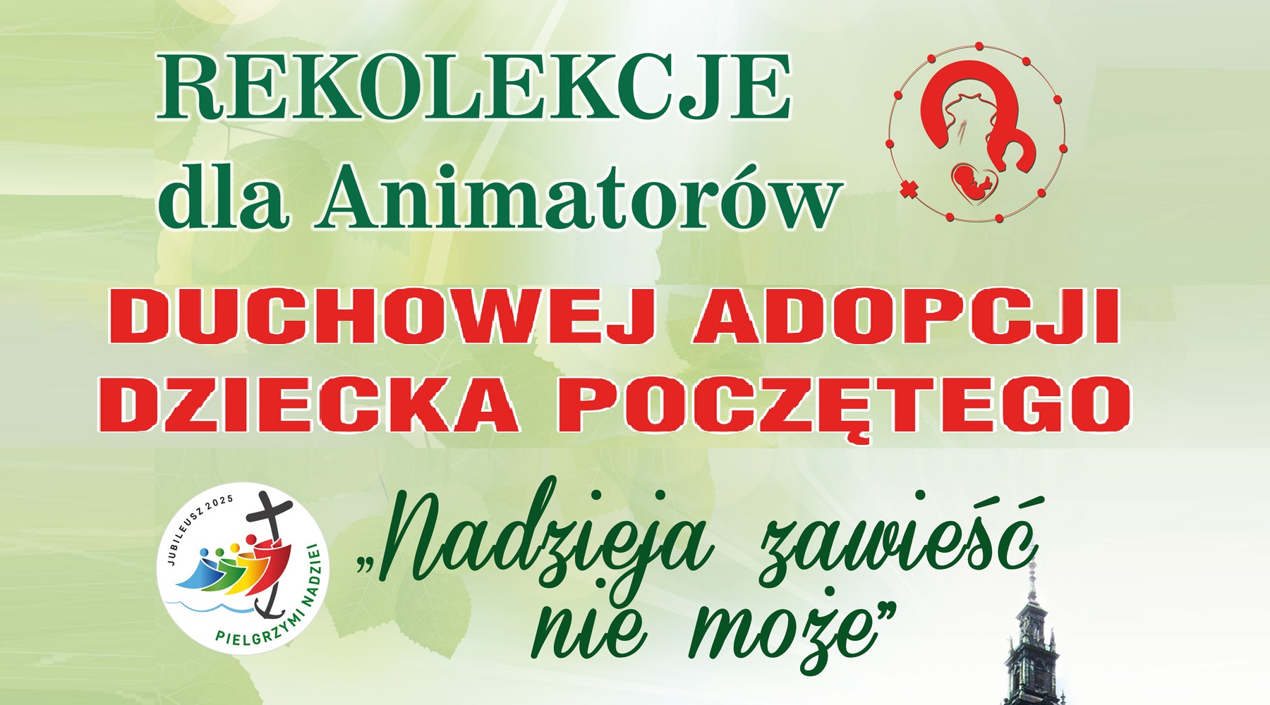 „W Roku Jubileuszowym, chcemy na nowo umocnić w sobie przekonanie, że każde życie ludzkie jest darem Boga i źródłem nadziei dla świata, dlatego hasło tych rekolekcji brzmi: „Nadzieja zawieść nie może” – napisał w zaproszeniu o. Samuel Karwacki OSPPE, Krajowy Moderator Duchowej Adopcji Dziecka Poczętego przy KEP. Rekolekcje będą okazją do dziękowania za owoce Duchowej Adopcji, a także umocnienia tych, którzy na co dzień troszczą się o rozwój i trwanie tego dzieła.
